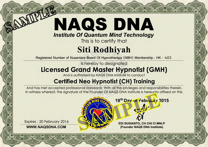 Master Neo Hipnotis WORKSHOP, Sertifikat CMH (Certified Master Hipnotis) & GMH (Licensed Grand Master Hipnotist)